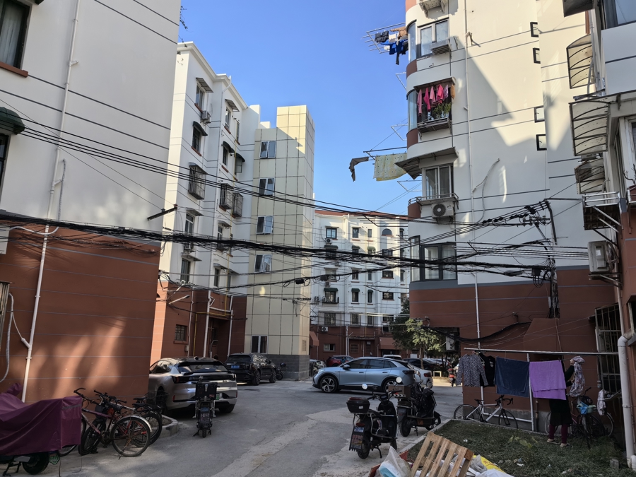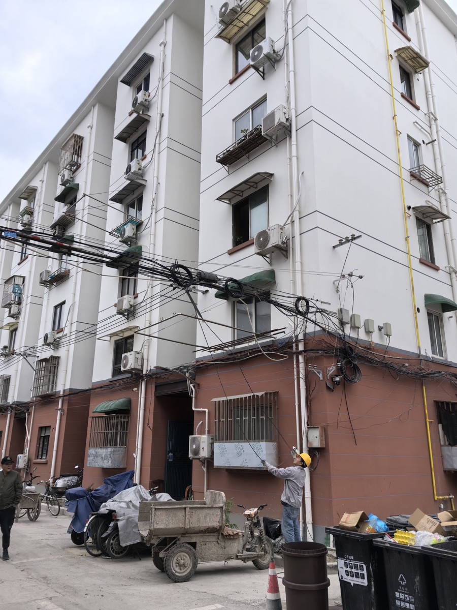 虹园六村小区空中密布的成捆黑色线缆交错复杂、松垮垂荡,与改造后的小区景象十分不协调。