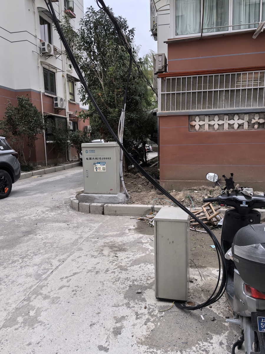 3个“横”出来的弱电箱在哪?在平塘路456弄26号楼北侧,一排临时停车位的西端,记者找到了其中的2个。箱子都是铁皮制成,半人高,半米余宽,箱门上标注了“中国移动”和“中国联通”标志。箱子均上了锁,多股黑色线缆从箱子底部接出来后向上延伸,最终并入小区天空中密布的架空线缆束中;第3个弱电箱则位于甘溪路100弄23号楼的西侧,箱体上印有“中国广电|东方有线”的标志。箱门锁坏了,铁丝绕着箱体捆扎了一圈取代了锁。记者解开铁丝打开箱子,可以看到里面是一排排的光纤接口,不少接口上插有细光纤,并汇总成了5根较粗的黑色线缆钻入地下,再从不远处的墙根处钻出,沿墙向上延伸后也并入小区架空线缆束。看得出,这些弱电箱是电信运营商布设在小区的交接设备。